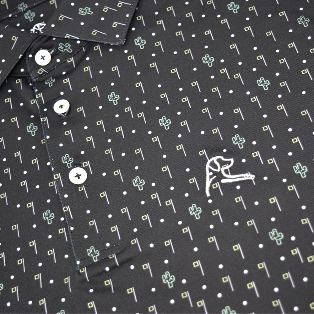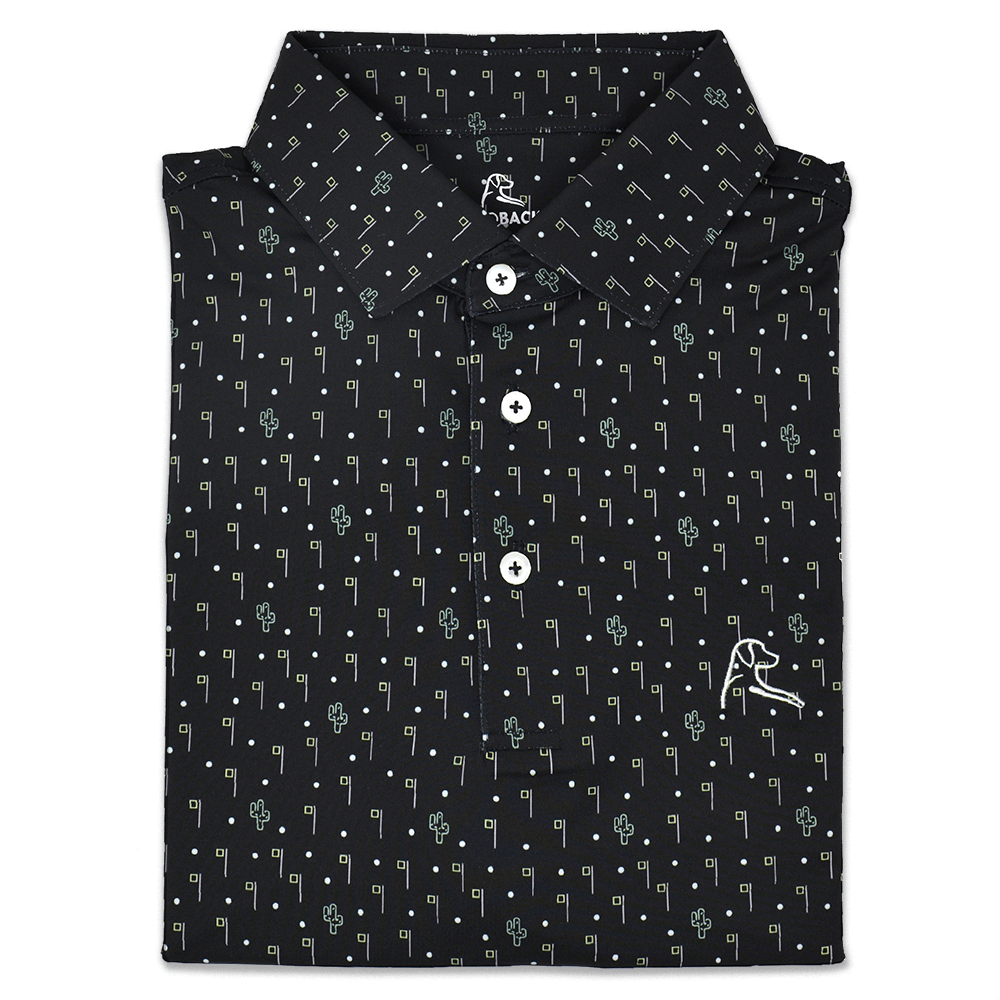 Stay cool and comfortable with The Scottsdale men’s performance polo in black with desert golf-themed print. Rhoback moisture wicking polos are breathable and quick-drying. With a four-way stretch and sharp comfort fit, don't expect this performance polo to get in the way of your golf swing or backhand. The Scottsdale men’s performance polo shirt with dog logo is designed to transition seamlessly from one activity to the next, whether it be golf, tennis, traveling, or just going casual. Wear it tucked or untucked. We’re confident our top of the line moisture wicking polos will fit your lifestyle like they do ours. Complete with the dog logo on the front and Rhoback Ridge on the back. Soft as a baby's bottom.