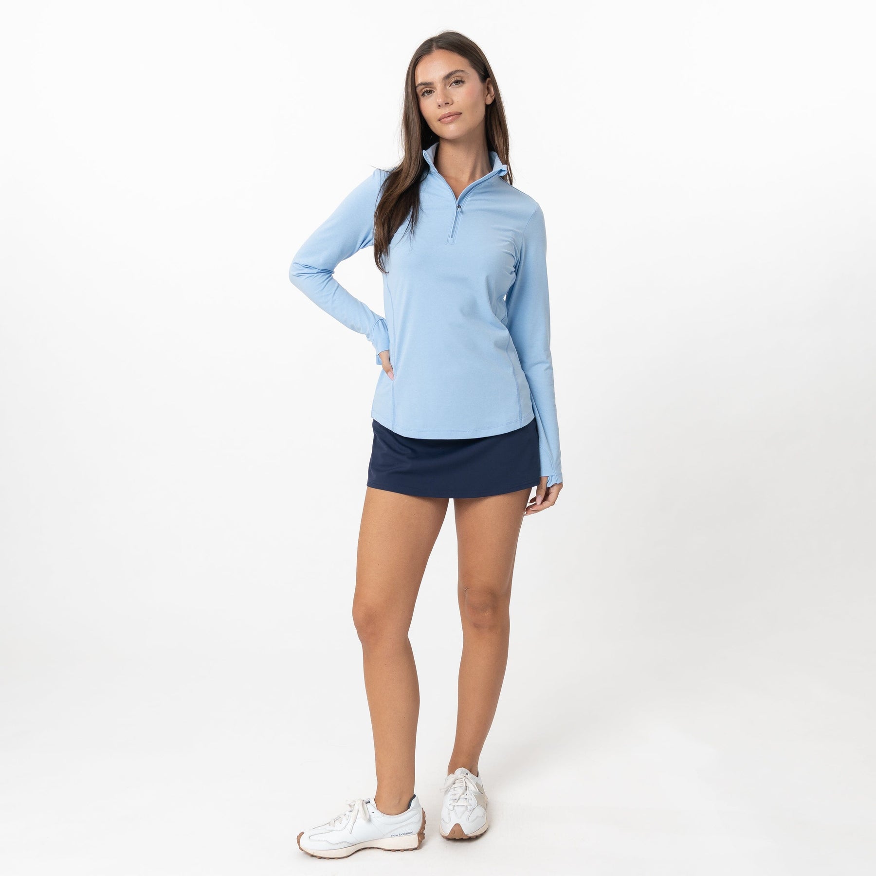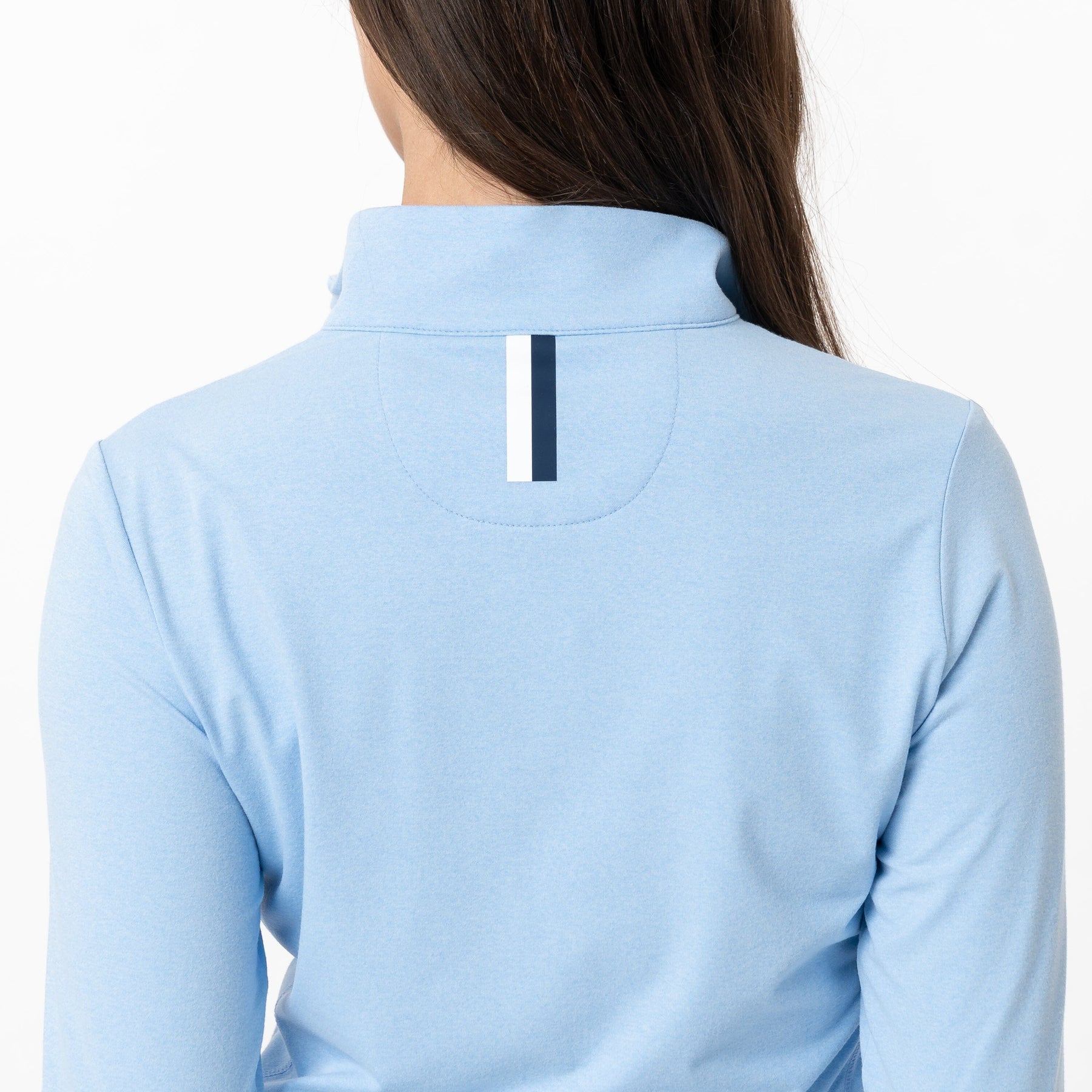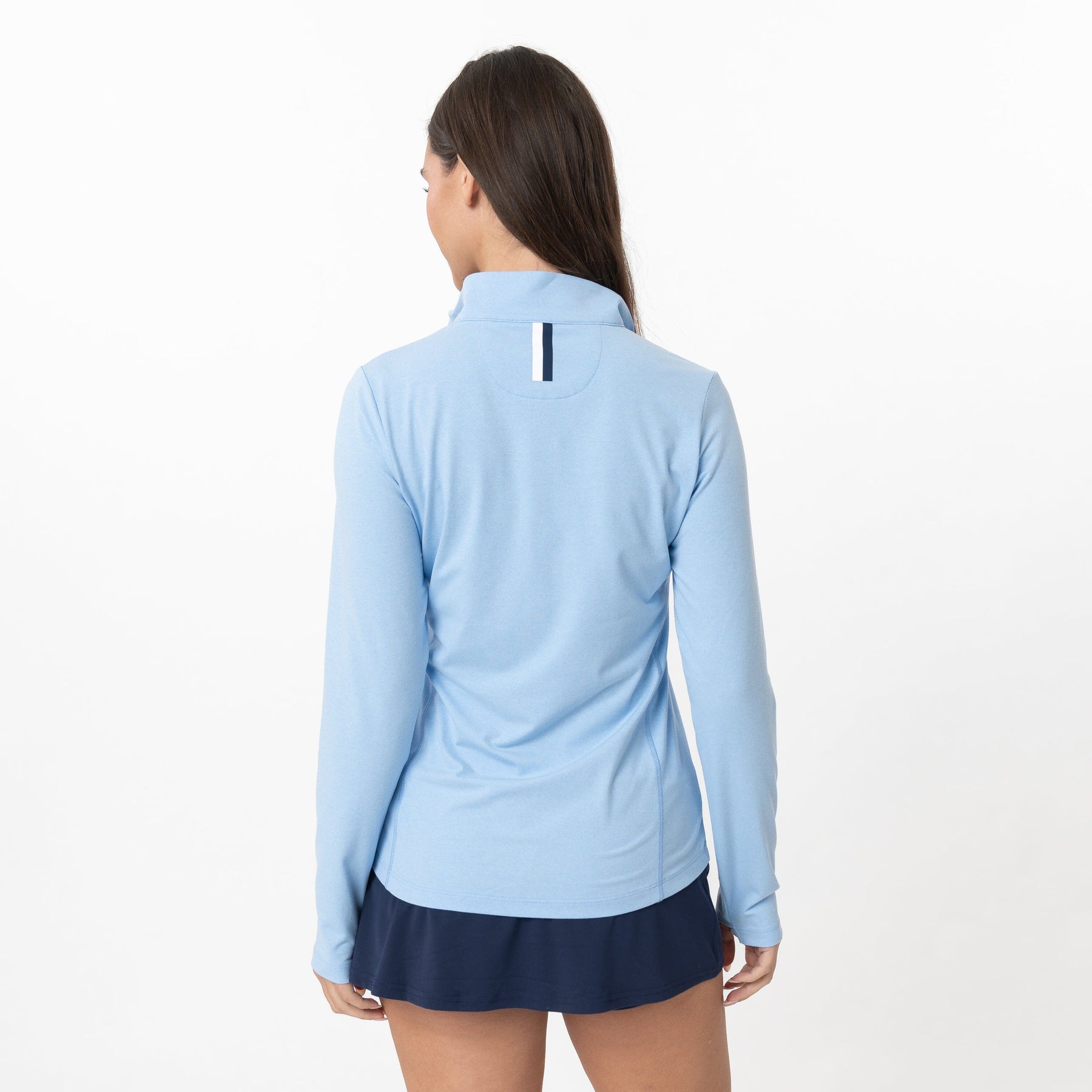 Feel comfortable and look sharp in the Heather Performance Q-Zip. Designed for those who crave activity, yet enjoy a classic look, this Q-Zip is the ultimate blend of comfort and style. Featuring four-way stretch and moisture-wicking technology, this Q-Zip is versatile, functional, and easy to move in. Made with incredibly soft fabric and a sharp comfort fit, it is an ideal secondary layer for cooler days. Finished with our Rhoback Ridge on the back, it pairs great with our Vista Active Skort.
